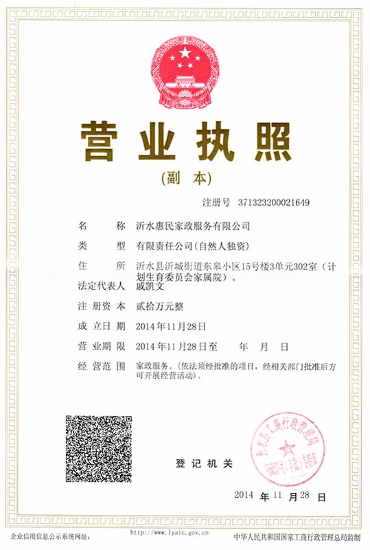 沂水惠民家政服務(wù)有限公司是具有獨(dú)立法人資格的大型家政綜合服務(wù)機(jī)構(gòu),成立于2014年11月28日,注冊(cè)資本20萬(wàn)元,注冊(cè)號(hào)是371323200021649;本公司以嚴(yán)謹(jǐn)?shù)囊?,?guī)范的服務(wù),系統(tǒng)的管理體系,優(yōu)質(zhì)的服務(wù)水準(zhǔn),誠(chéng)信經(jīng)營(yíng)、客戶至上,走高… 詳情請(qǐng)點(diǎn)擊
