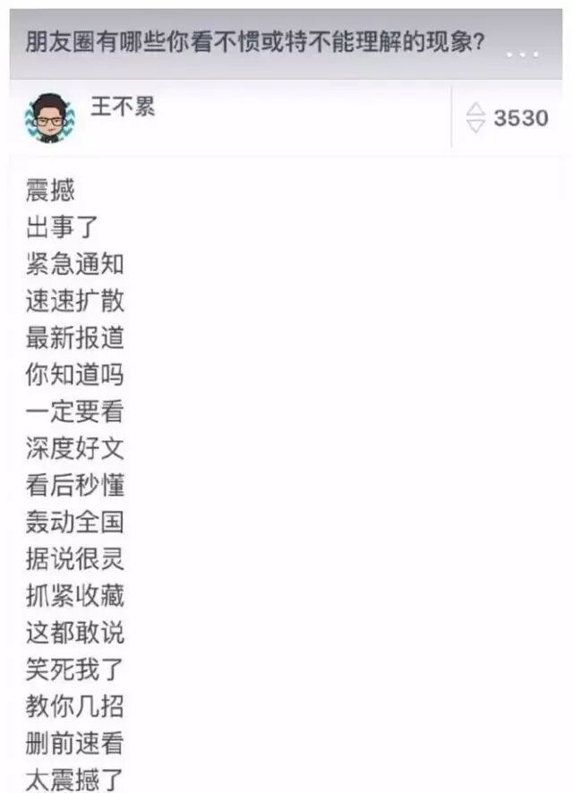 一篇爆文的背后離不開一個標題黨!近日,網上一篇名為《朋友圈有哪些你看不慣或不能理解的現象?》的文章在朋友圈熱傳,文章列舉了188種平日在朋友圈常見的標題黨元素,其中包括:迅速擴散、不轉不是中國人、刪前速看等等,看完讓人忍俊不禁。