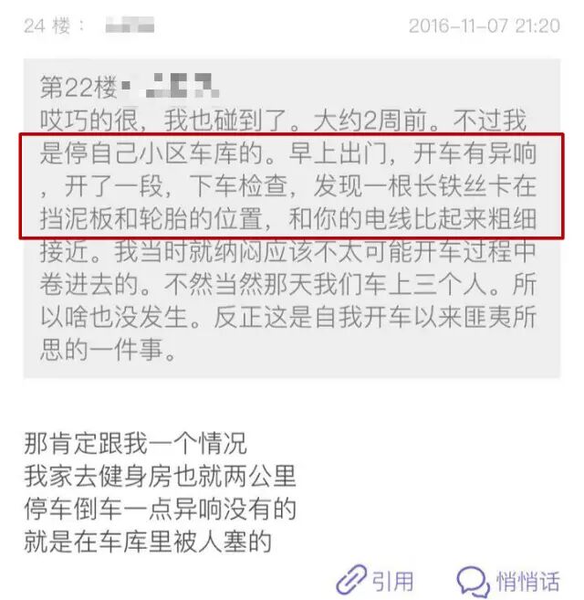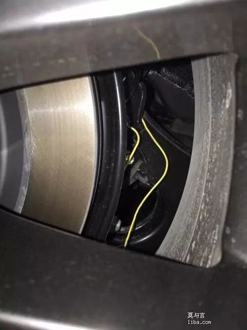 把車從商場停車庫開出來,聽到車子有異響后下車檢查,發(fā)現(xiàn)右后車輪莫名其妙地,被纏了好幾圈皮線。