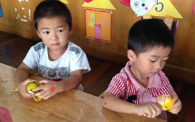 孩子們瘋玩了一陣,我看他們有些流汗的樣子,就招呼他們過來喝點(diǎn)水,吃點(diǎn)水果。這時(shí),峰峰拿出來一個(gè)橘子,他不太會(huì)剝,苦惱地問峰峰媽:“媽媽,橘子為什么需要?jiǎng)兤げ拍艹阅兀俊?