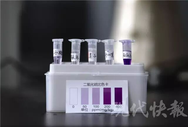 銀耳、蓮子、開心果的樣品液顏色接近無色透明,檢測結果均小于 50mg/kg,符合標準;冰糖樣品液顏色略微顯現淺紫色,對照比色卡,介于 50mg/kg 到 100mg/kg 之間,符合標準。
