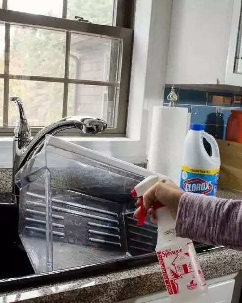 用漂白水混合溫肥皂水放在噴霧瓶里,搖晃均勻,哪里不干凈噴哪里。